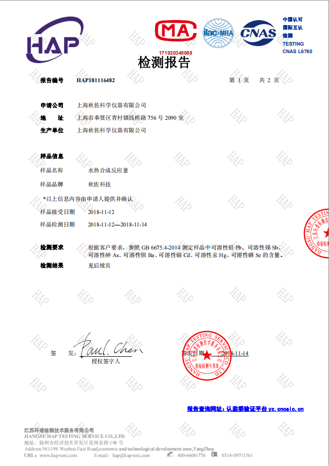 水熱合成反應釜質檢報告