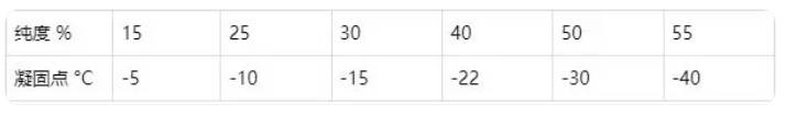 2. 使用溫度- 30℃——10℃時(shí),建議采用下表所述的乙二醇水溶液,最低使用溫度應(yīng)高于凝固點(diǎn)10℃以上;或采用99%純度乙醇。
